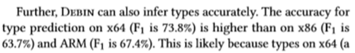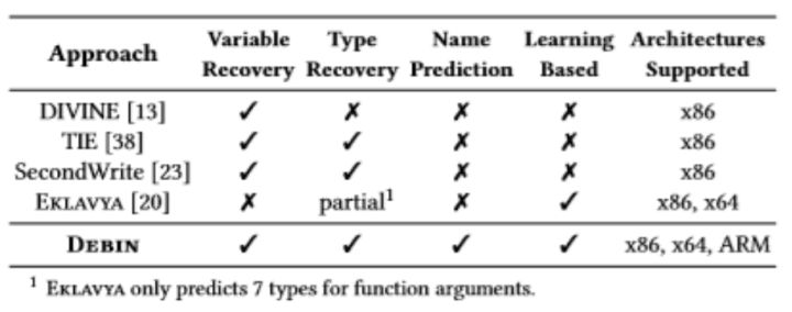 [3] He J, Ivanov P, Tsankov P, et al. Debin: Predicting debug information in stripped binaries[C]//Proceedings of the 2018 ACM SIGSAC Conference on Computer and Communications Security. ACM, 2018: 1667-1680.