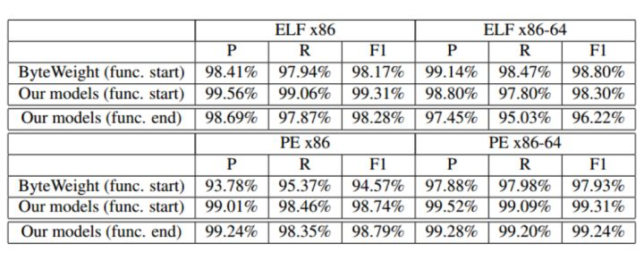 最后,我们也可以看到,在文中,也提到了其工作,比14年的工作ByteWeight的效果更好,且在两个平台上都达到了不错的效果。与前人工作不同的是,其不仅识别了函数的开头,还识别了函数的结尾部分,因此工作会更加全面,且更有实际效用。
