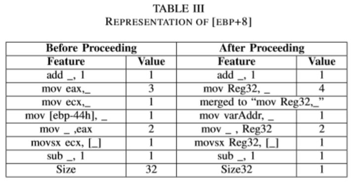 可以看到,对具体的“特征”挑选则是重中之重。如下图所示,我们可以看到,文中对于特征的选择就是直观的不同操作的类型的统计,其中值得注意的是,在处理之前的“mov,eax”和“mov,ecx”被合成一个“mov reg32”了,同时对于变量的长度也有了初步的判断,是“32”的长度。通过这样的处理,一个变量对应的对应表示形式,就成了一个向量了。为使得每一个样本的长度都是相同的,文中选取了“最重要”(TF-IDF)的100维特征。