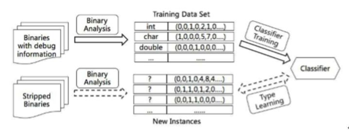 机器学习对于二进制的帮助,仅限于此吗?其实是远远不止的。近几年,大家对于二进制的信息挖掘是更加火热的。二进制对于人来说难以阅读的一大原因是缺少语义信息,那这部分信息很大程度上都是通过变量的类型来提供的。这对应到自然语言中,我们可以理解为一个句子中的单词的词性。一旦我们能了解其中的词性关系,我们一定能取得更好的分析进展。18年的一篇工作,则以很直观且巧妙的方法来给我们打开了二进制分析的思路。具体的流程如下图所示: