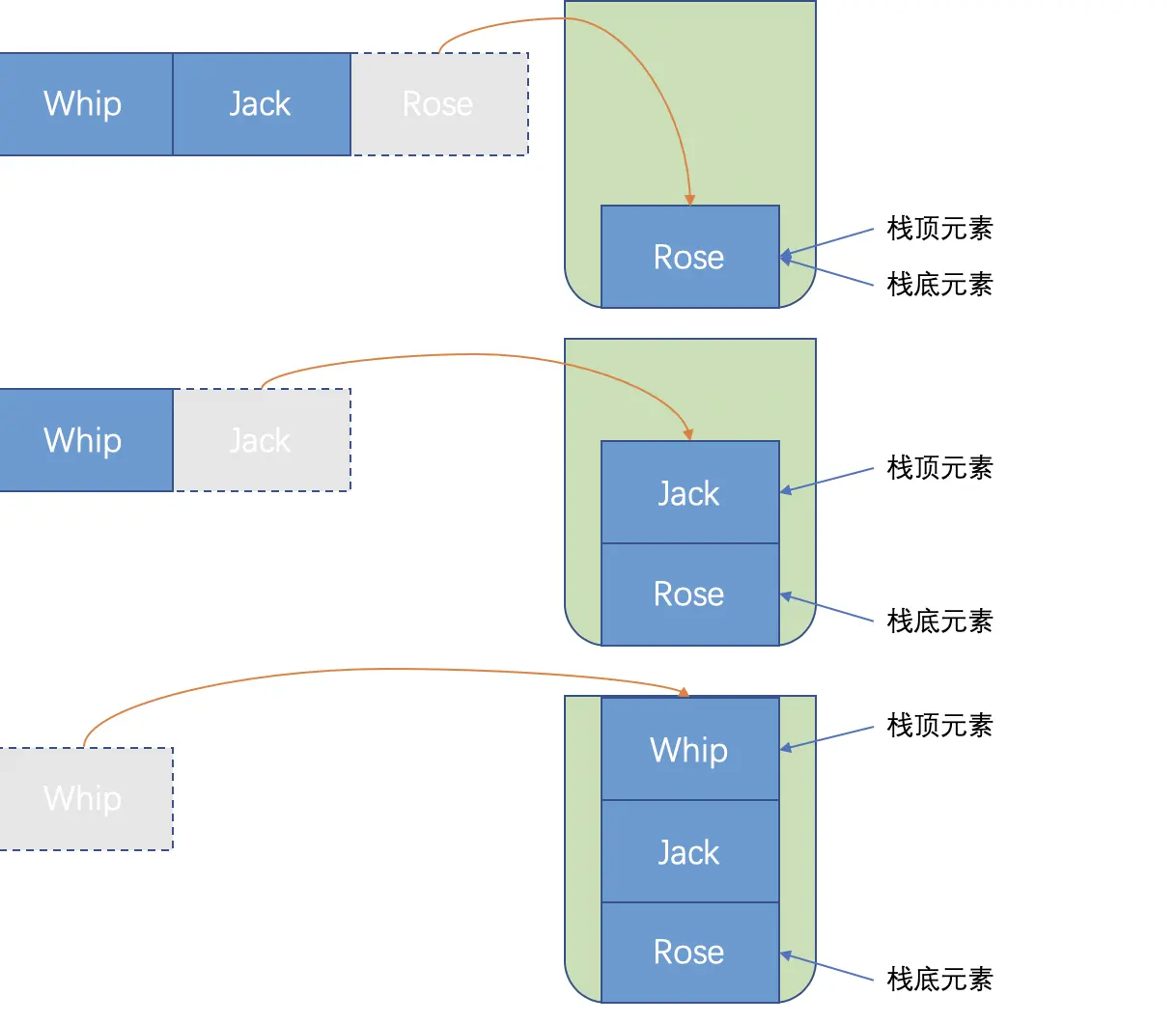 而出栈即每次都去栈顶元素,如上图出栈的顺序应该是:Whip、Jack、Rose,刚好和入栈顺序相反。