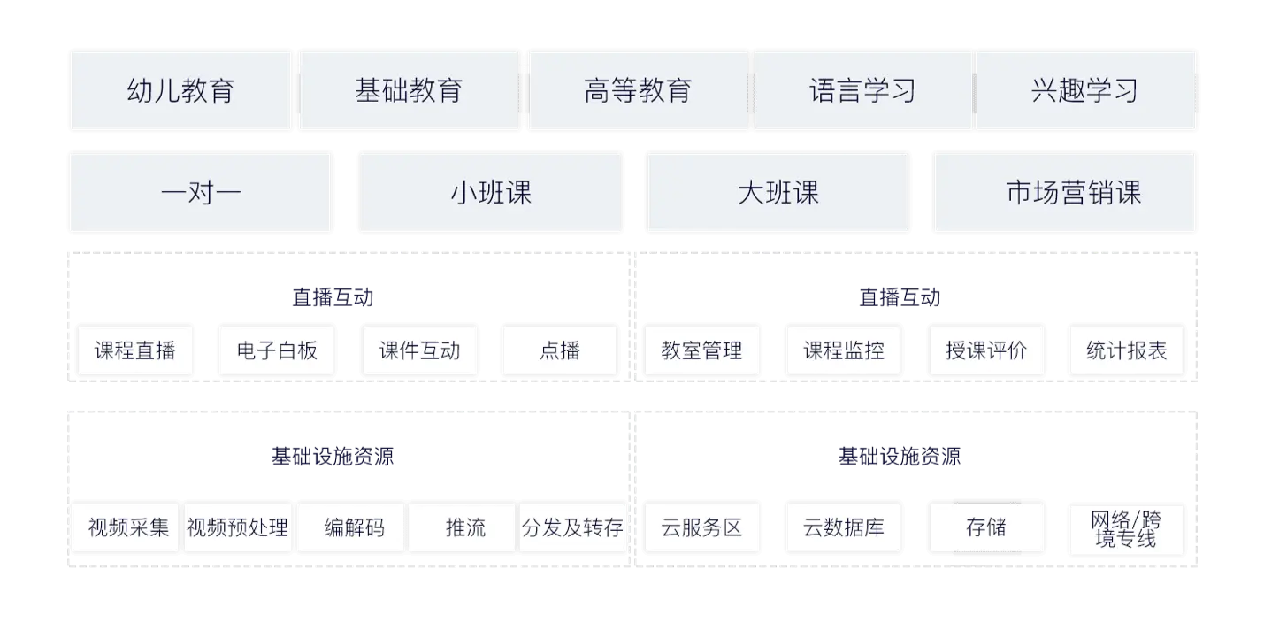 该方案可全面覆盖在线教育业务场景,有效保障在丢包、抖动网络下的1V1、小班课互动教学体验,并通过优质直播平台,覆盖全国大班课直播,为客户提供高品质、一站式、稳定安全的互动教学体验。同时通过人工智能对1V1授课进行客观评价并对内容进行风险控制。