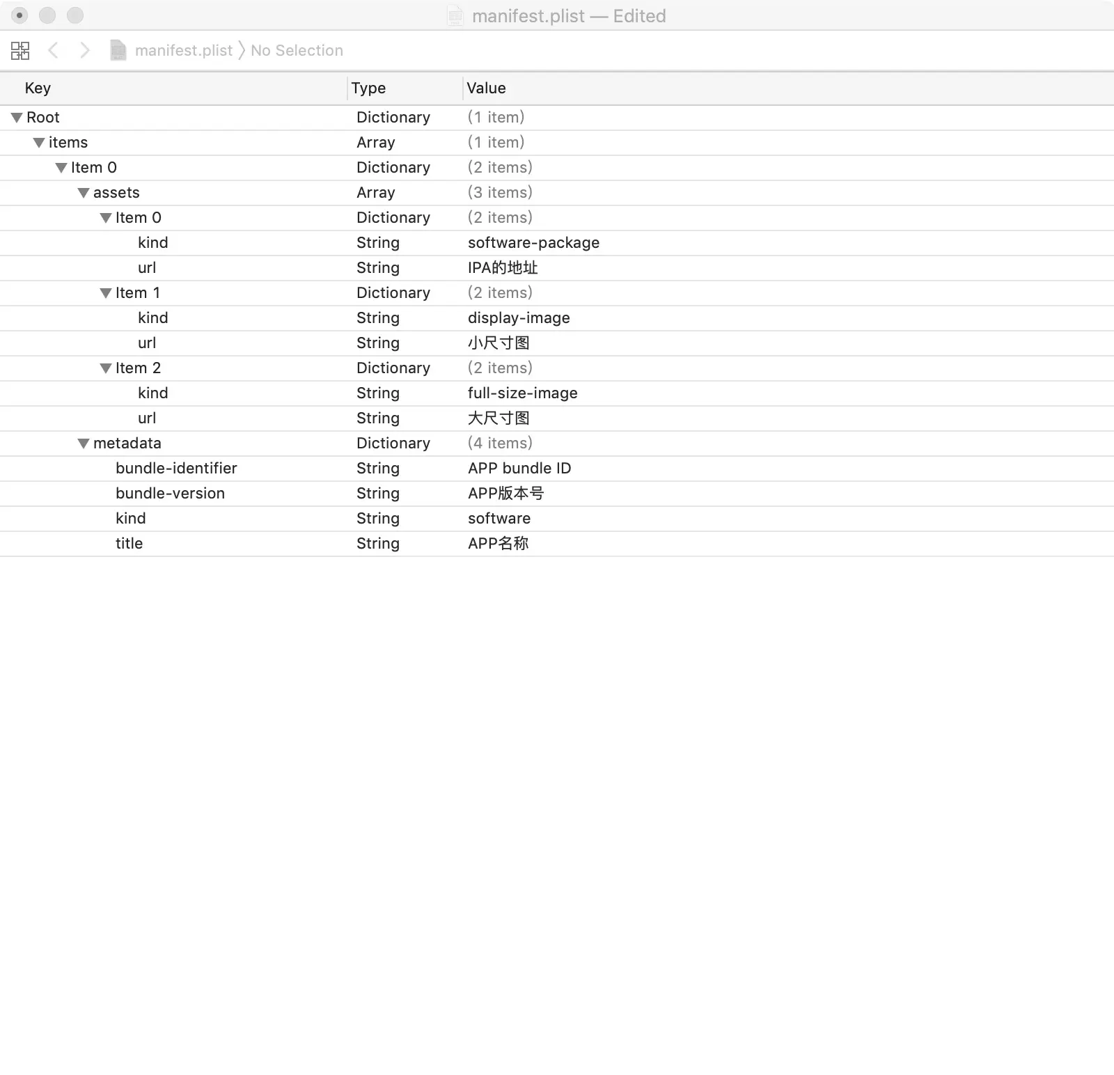 新建目录 命名 然后把两张图片和IPA文件上传 然后编辑manifest 内容