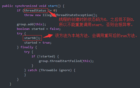 - Thread对象创建后处于NEW状态,threadStatus这个内部属性为0,在start方法中会判断这个内部属性是否为0,如果不等于0会发生异常,所以说不能重复调用start方法或者在线程 结束后重新start。