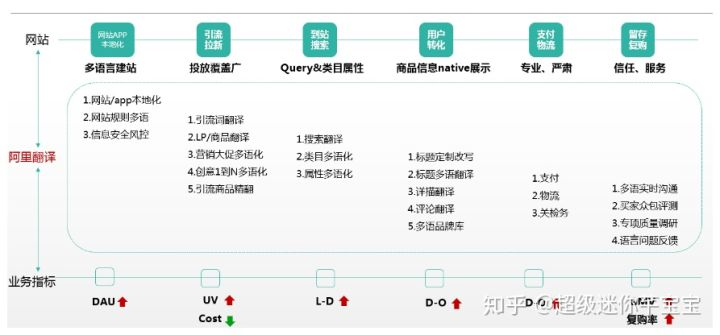 阿里巴巴机器翻译在整个电商完整链路上都提供了优质的服务能力。包括:SEO(搜索引擎优化)、搜索、商品标题、商品详情(类目/属性/描述)、商品评论、实时沟通、审核风控等电商基础数据领域,都能提供全面的实时翻译服务能力,解决各个国家用户对信息的基本阅读需求。