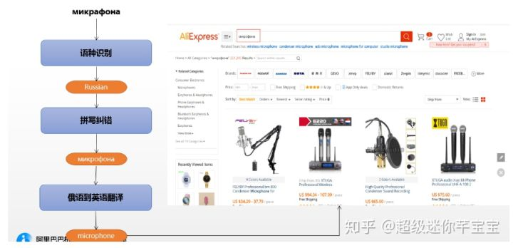 如下图示,AliExpress的俄罗斯用户用俄语搜索了“麦克风”,智能语种识别出用户所用语言是俄语,之后调用拼写纠错功能。调用该功能是因为在用户输入检索词中,很有可能出现个别单词的错误,因此就需要智能拼写纠错功能将个别拼写错误的词纠正过来,机器翻译再翻译成英文版本,最后调用搜索引擎,拿到用户想要的商品信息。这样,一条提升用户从List到Detail转化率的链路就打通了。