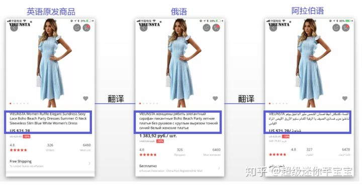 下图展现的是阿里巴巴速卖通场景下对标题部分做的工作。我们可以看到,商品属于英文的原发商品,而通过翻译可以将其翻译成为不同国家的语言。在下图中,同样的一条裙子的标题除了英文之外,还被翻译成了俄语和阿拉伯语两个版本。