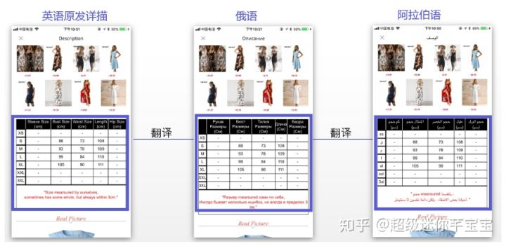 在阿里速卖通中,一般而言,商家发布版本基本上都以英文为主。由此,机器翻译就需要将英文原发的商品详细描述,比如商品尺寸、质量属性以及物流信息等都翻译成其他语言的版本。