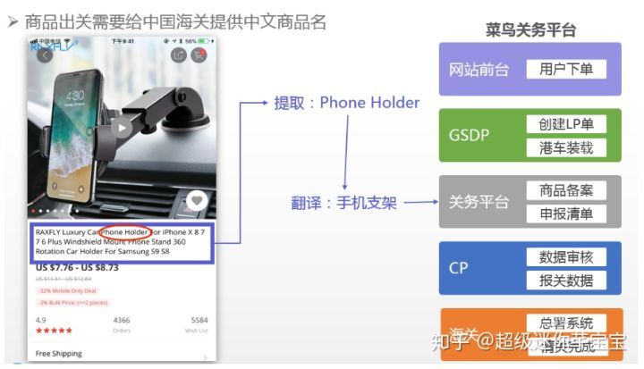 在跨境电商场景中,商品物流有一个必须步骤,就是商品通关。在下图中,商品是一个手机支架,但它的英文名非常长,而海关可能只希望拿到商品的关键信息。这时,NLP智能品名生成技术就会从一长串的标题里抽取出关键词,如图示就抽出了“Phone Holder”关键词,再把这个关键词通过机器翻译转成中文的“手机支架”,由此海关便能迅速获知该商品的信息,高效便捷地完成产品的通关过程。