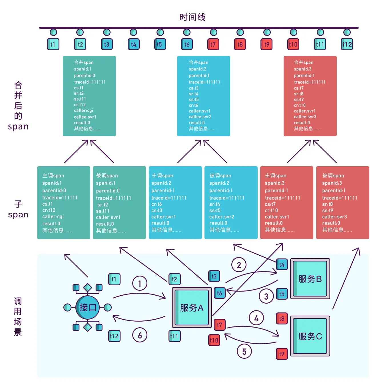 其实span块内除了记录这几个参数之外,还可以记录一些其他信息,比如发起调用服务名称、被调服务名称、返回结果、IP、调用服务的名称等,最后,我们再把相同spanid的信息合成一个大的span块,就完成了一个完整的调用链。感兴趣的同学可以去深入了解一下链路追踪,希望本文对你有所帮助。