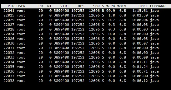 执行top命令,找到java进程CPU总的使用率105.6%,进程id为22024