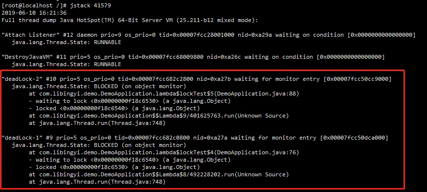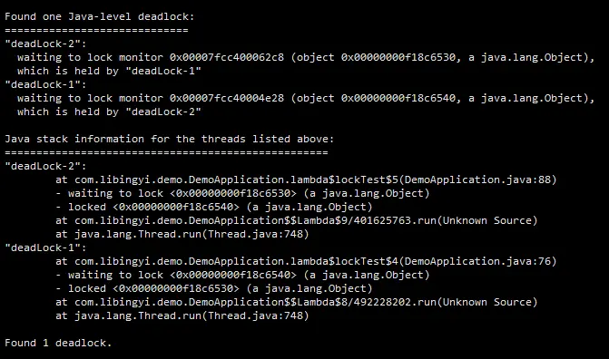 jstack 41579,发现deadLock-1,deadLock-2线程都处于阻塞状态,最下面会直接给出死锁信息