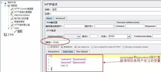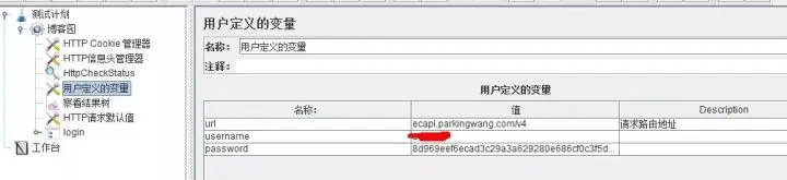 在接口测试中,某些变量是全局的,我们可以放在用户定义的变量,比如这里接口请求的url,登录的用户名和密码我们可以放在用户定义的变量,其它接口用例直接调用,见截图: