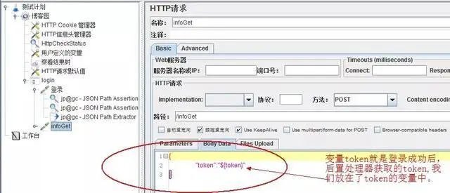 这里我们使用第二种的方式,在login的接口用例中增加后置处理器,并且获取token,见截图: