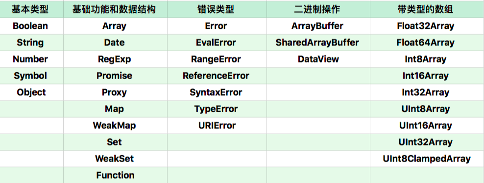 URIError、ArrayBuffer、SharedArrayBuffer、DataView、Typed Array、Float32Array、Float64Array、Int8Array、Int16Array、Int32Array、UInt8Array、UInt16Array、UInt32Array、UInt8ClampedArray。