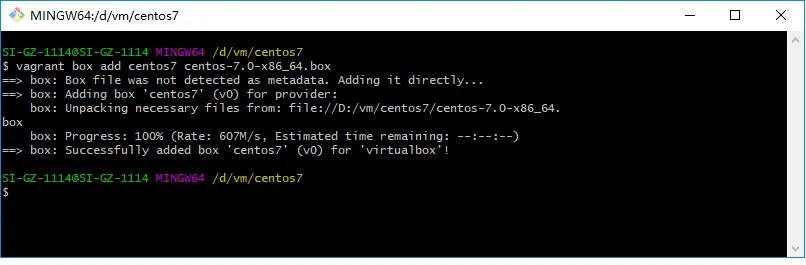 在当前目录打开Git Bash,使用命令:vagrant box add centos7 centos-7.0-x86_64.box把box添加到vagrant