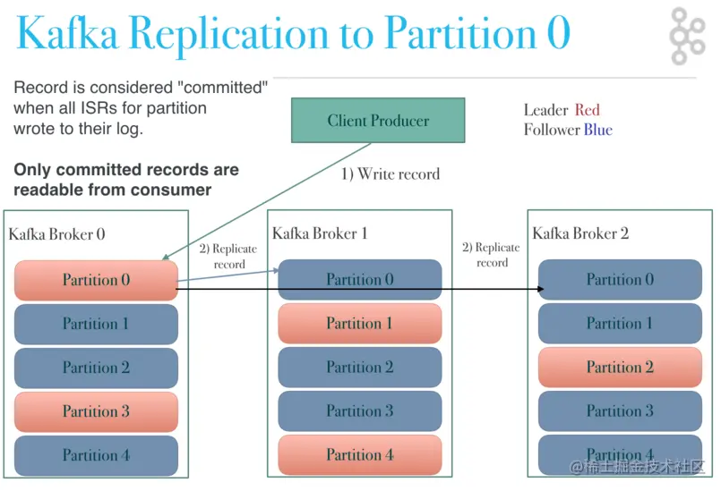 每个partition都有一个leader(主副本),零个或多个follower(从副本)。每个leader和follower都是一个broker(不同partition的副本可以在同一个broker)。Kafka会把所有partition的leader平均分配到broker上,所有的读写都只由leader来完成,follower只从leader同步消息,并不对外服务。