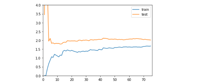 线性回归的学习曲线:plot_learning_curve(LinearRegression(), X_train, X_test, y_train, y_test)