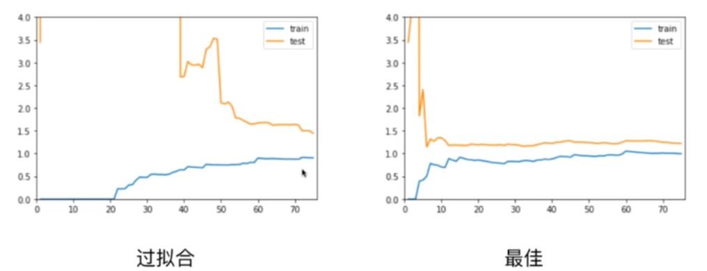 2、过拟合 训练数据集误差与最佳差距不大 对于测试数据集误差偏大,并且两个误差之间的差距比较大。