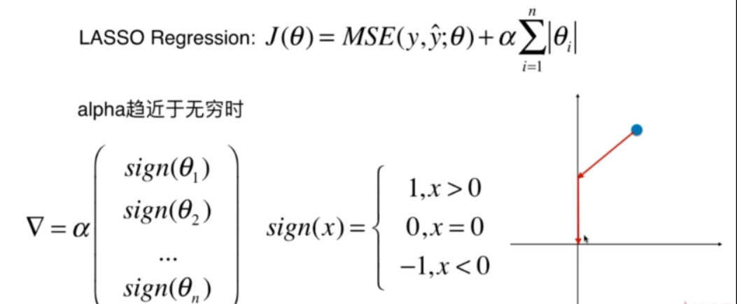 而LASSO对后一项进行梯度下降法,如下图所示,先沿着某一方向,找到一个轴,然后沿着这个轴走向原点。而在某个轴为0点,就会使得很多个θ=0.