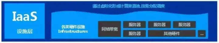 第一层:基础设施即服务(Infrastructure-as-a-Service),你不用自己建机房、不用操心网络、不用担心数据存储,所有的CPU、内存、存储、网络和其它基本的计算资源都会提供出来,用户可以在上面随便安装操作系统和软件。