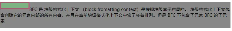 <p>BFC 是 块级格式化上下文 (block fromatting context)是按照块级盒子布局的。 块级格式化上下文包含创建它的元素内部的所有内容,并且在当前块级格式化上下文中盒子竖着排列。但是 BFC 不包含子元素 BFC 的子元素</p>