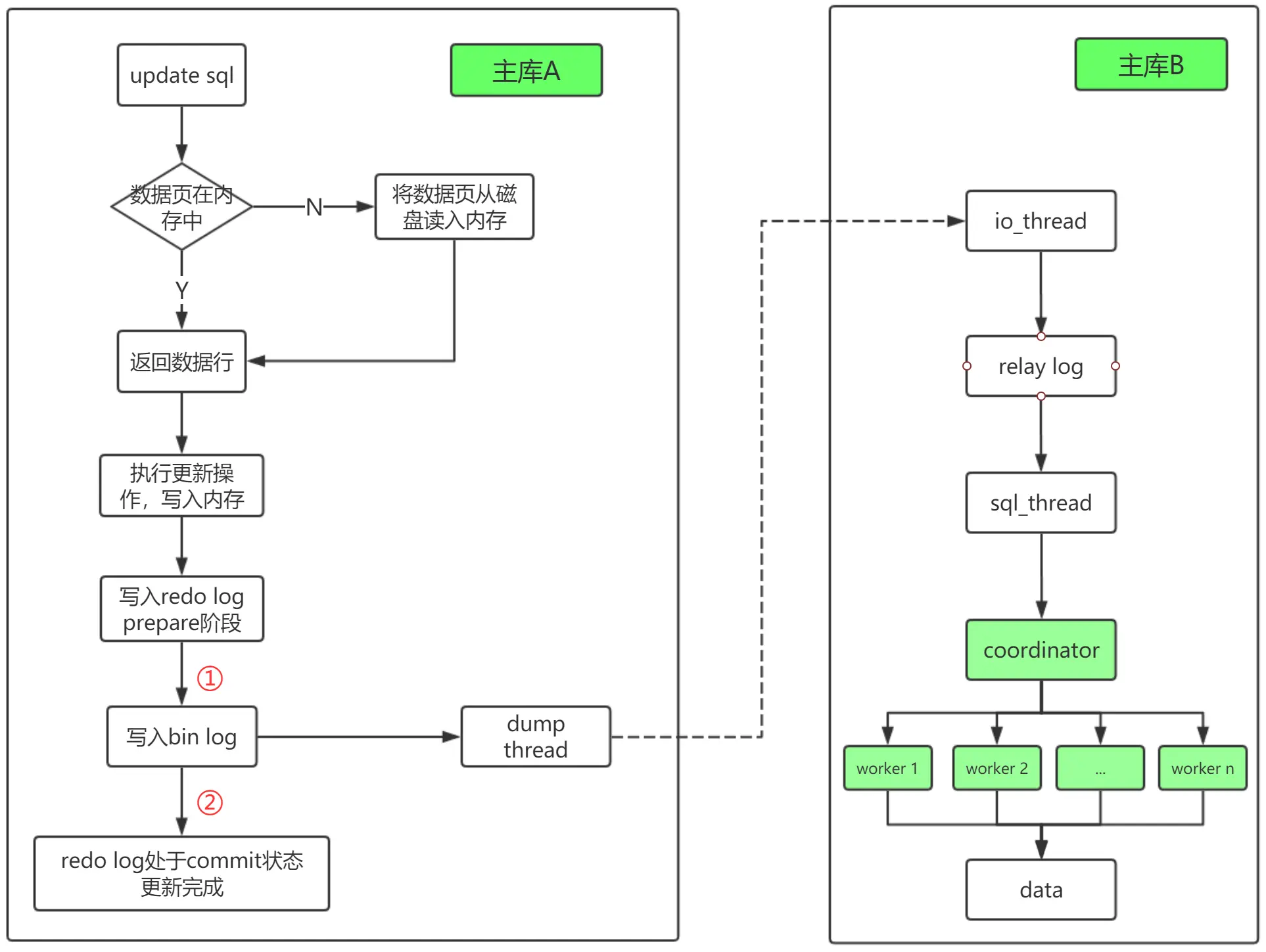 coordinator就是原来的sql_thread,但是它不再直接更新数据,只负责读取relay log和分发事务- 真正更新日志的,是worker线程,worker线程的数量通过参数