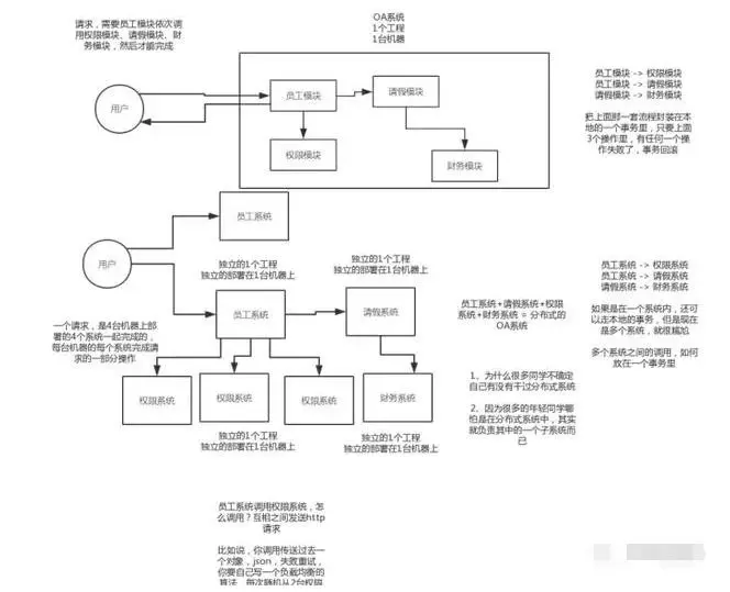 分布式系统,我用一句话给你解释一下,就是原来 20 万行代码的系统,现在拆分成 20 个小系统,每个小系统 1 万行代码。