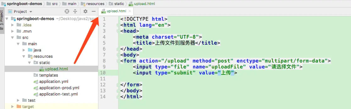 如下图所示:在resources目录的static文件下创建upload.html文件。(如果static不存在,就自己创建一个static文件)