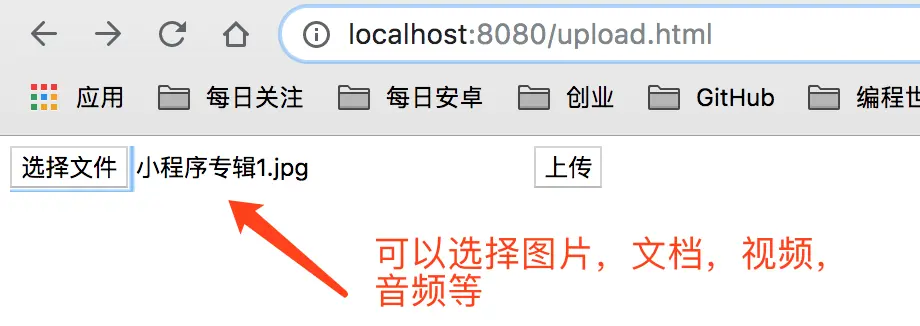 1,启动项目,如何启动前面章节有讲,这里不再啰嗦。 2,访问upload.html,输入下图所示的网址,即可访问
