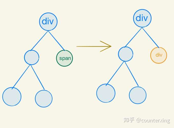 接下来,考虑节点是否真的需要更新,如图所示,一个节点的类型从span换成了div,显而易见,这是一定需要我们去更新DOM的:
