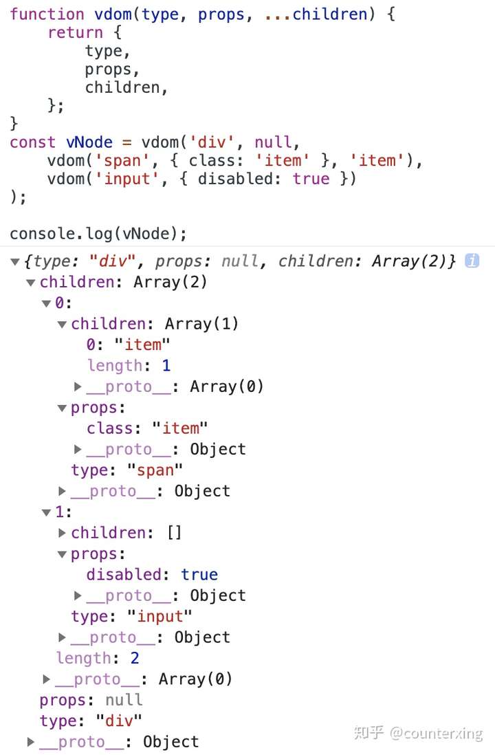 在控制台输入上述代码,可以看到,已经创建好了用 JavaScript对象表示的 Virtual DOM 树: