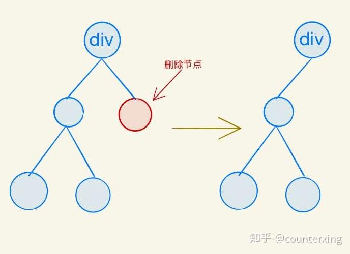 同理,对于删除一个旧节点的情况,我们通过removeChild来实现,在这里,我们应该从真实 DOM 中将旧的节点删掉,但问题是在这个函数中是直接取不到这一个节点的,我们需要知道这个节点在父节点中的位置,事实上,可以通过$parent.childNodes[index]来取到,这便是上面提到的为何需要传入index,它表示当前更新的节点在父节点中的索引: