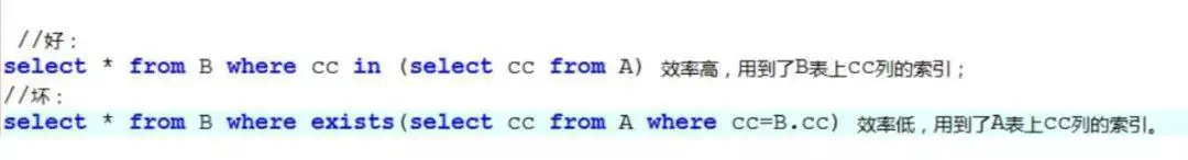 如果查询语句使用了not in 那么内外表都进行全表扫描,没有用到索引;而not exist 的子查询依然能用到表上的索引。所以无论哪个表大,用not exists都比not in要快!