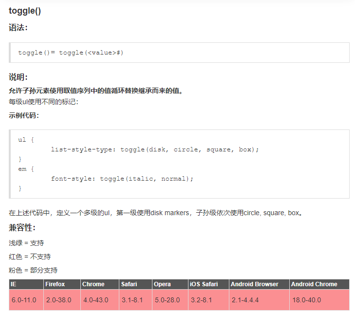 <p>toggle() 函数在规则选中多于一个元素时生效,它会在几个值之间来回切换,比如我们要让一个列表项的样式圆点和方点间隔出现,可以使用下面代码:</p>