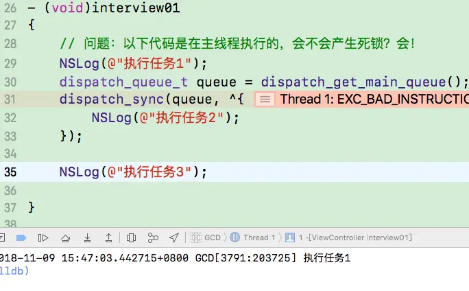 其中在主队列viewDidLoad里面的任务3执行结束才会执行任务2;而主线程中是执行完sync才会执行任务3。也就是任务2等待任务3执行,任务3再也等待任务2执行,造成死锁