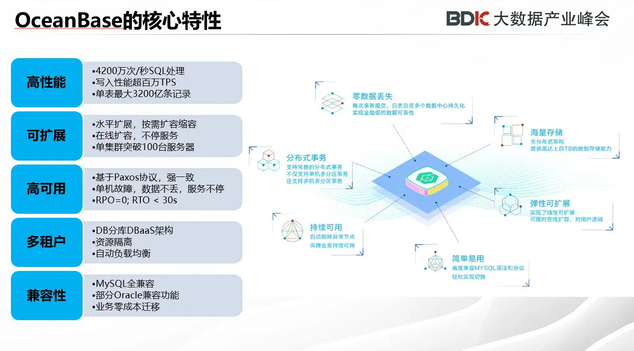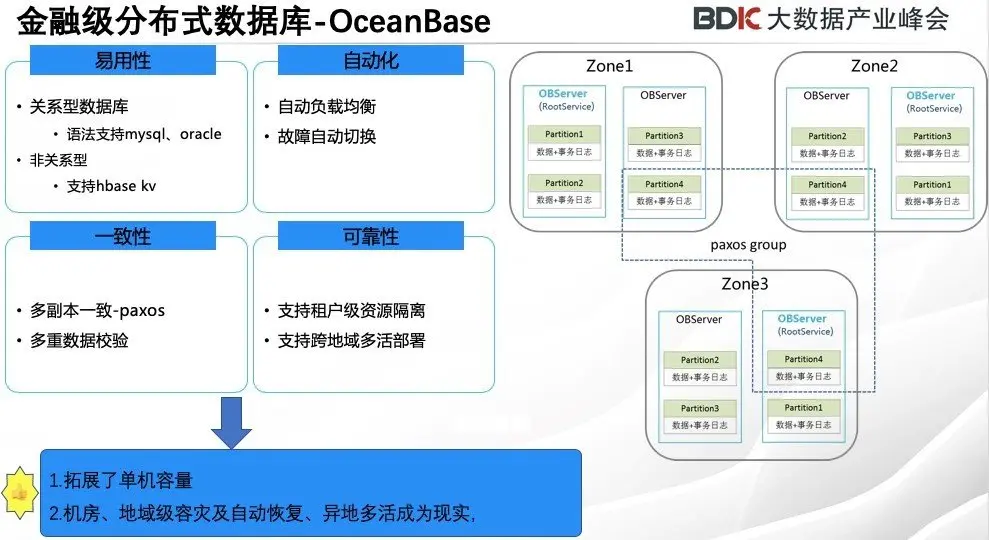 右侧是 OceanBase 部署示意图。OceanBase 集群至少要部署三副本,并使用 paxos 协议保持数据一致性。并具备如下的能力和优势:
