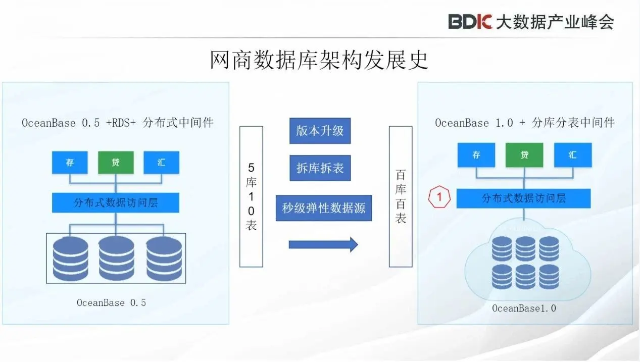 网商银行从建设之初,采用 5 库 10 表的设计。升级到 OceanBase 1.0 后,逻辑架构进行了水平数据拆分,从 5 库 10 表到 100 库 100 表,支持全行业务系统运行在 100 个逻辑单元,最大可支持物理部署在多地的 100 个数据中心进行并行数据处理,用于满足指数级的金融业务增长需求。