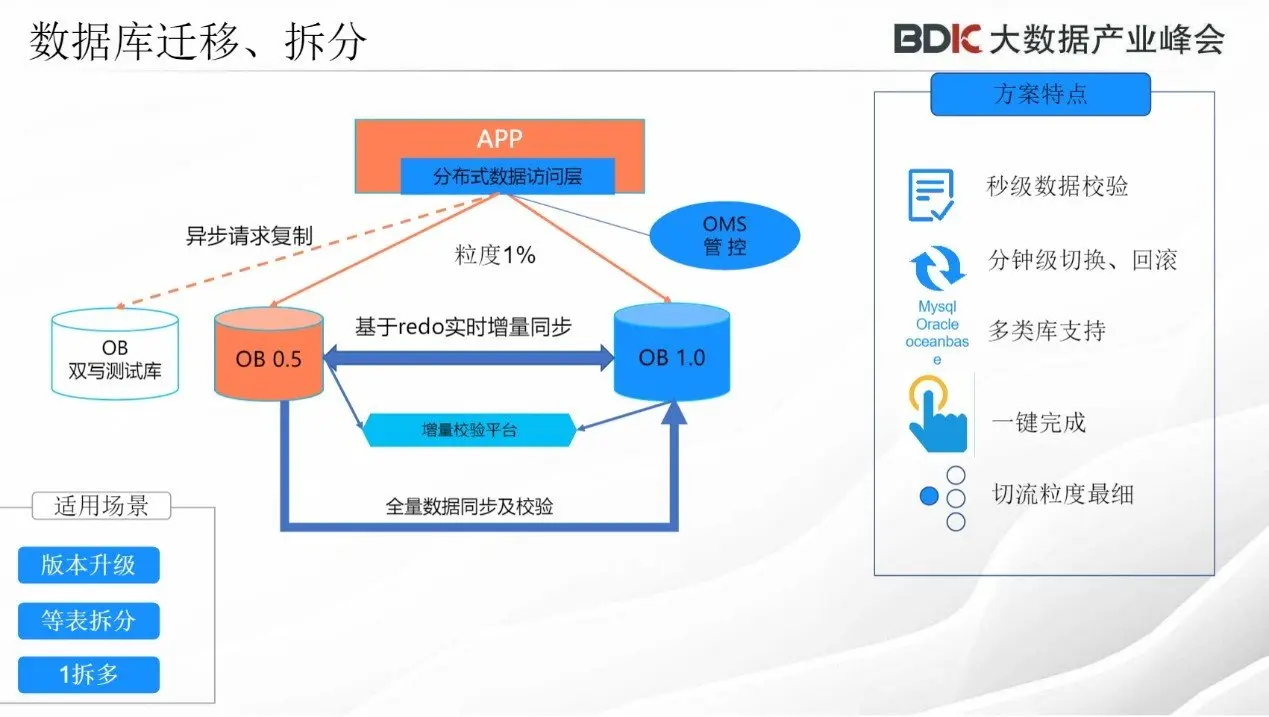 OMS 是数据库拆分、迁移的利器,适用于在数据库版本升级、等表拆分和1拆多等场景中。无论数据库是同种类型,还是异构,实现了弹性拆分,同时也将影响面控制在最细粒度,可分钟级完成。