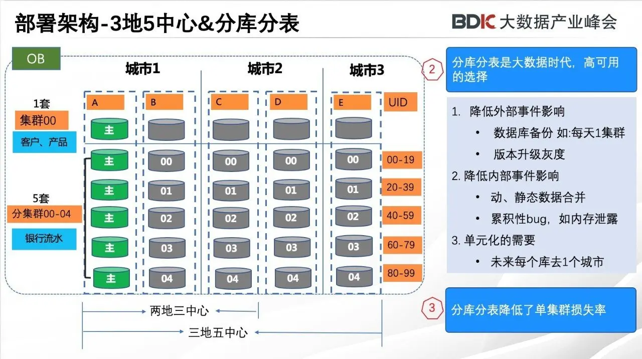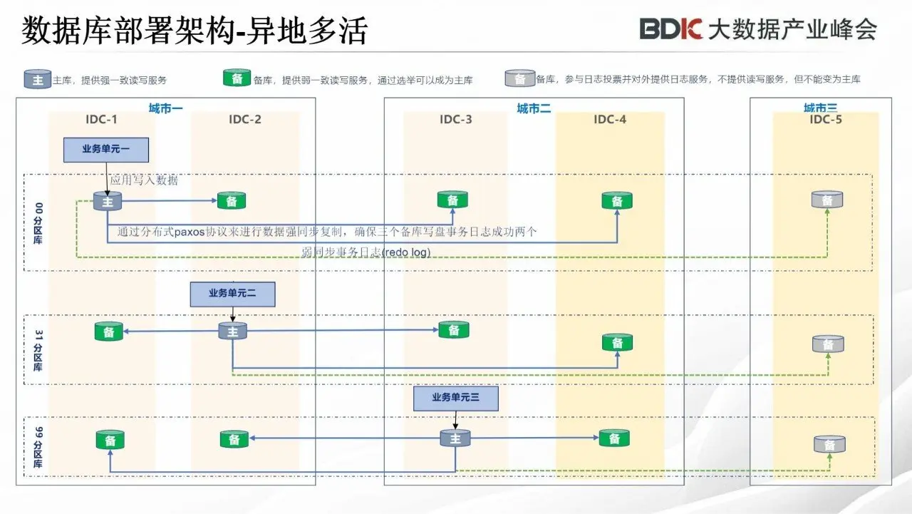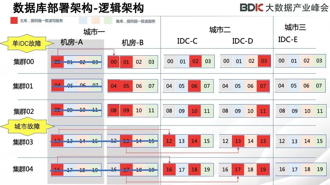 为了数据源的高可用,分布式数据库从架构角度,来进行分集群的设计,来降低特殊情况下的影响;伴随业务发展,数据中心的集群需要分摊到更多城市,实现单元化,来降低单集群的容损率。
