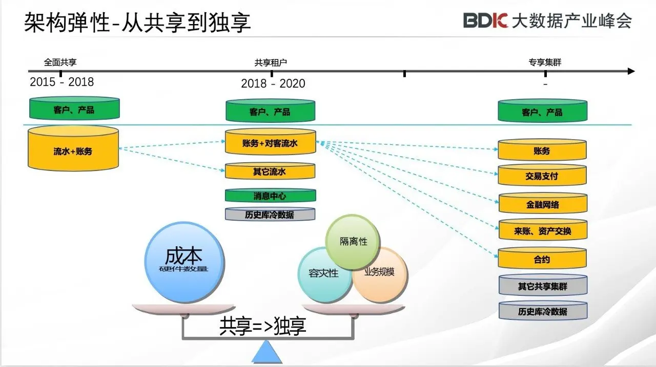 从全生命周期的视角,数据库架构的发展是从全面共享到租户共享,再到集群专享的路线;因此,数据库架构需要高弹性,在资源少的时候共享,资源多的时候独享。