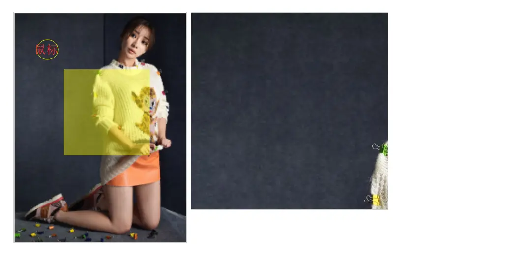 首先布局上,很明显要准备两个基本的容器,一个small,一个big,还要准备两张完全相同的图片,但是尺寸不同,每个容器中放入相应大小的图片,但是小的容器中还要放入一个可以移动的遮罩。其次就是在实现上,可根据以下步骤来一步一步完成。