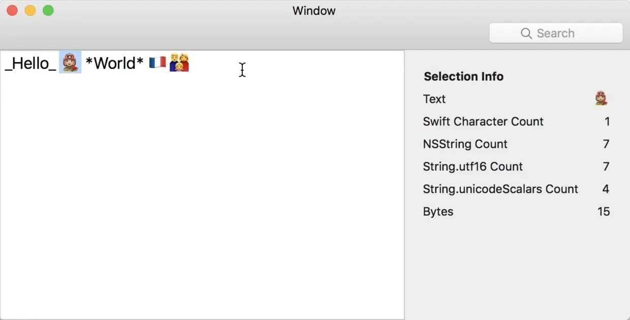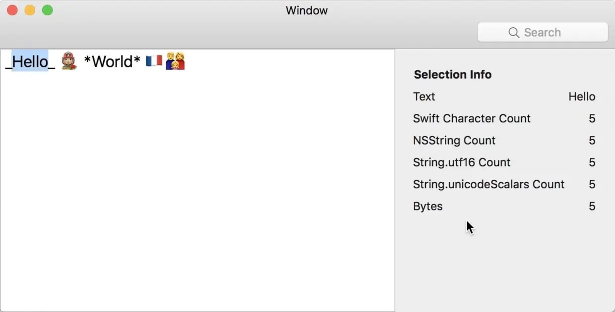 这会产生一些有趣的信息。如果我们再次选择“Hello”,则信息看起来很简单,因为Swift字符串和NSString都是五个字符长,Swift字符串的其他视图也是如此: