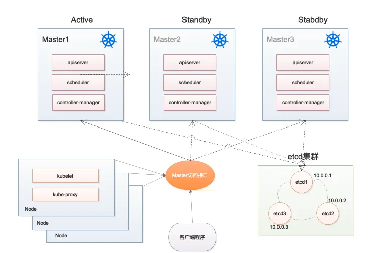 Kubernetes集群各模块,主要分为客户端,Master节点,Node节点,etcd集群。