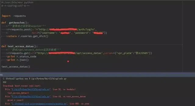 执行如上的代码后,我们发现代码错误,错误的原因是test_access_datas()函数没有带上登录成功后的session,所以导致错误,不带session,一般直接就跳转到了login的页面,让重新登录,那么如何解决了,我们只需要在test_access_datas()函数中,在接口请求中带上session就可以了,见修改后执行的代码: