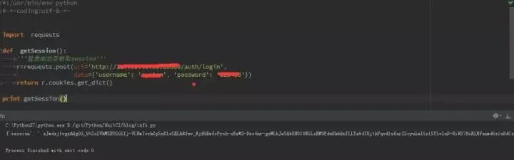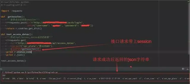 下面我们使用python来处理session的部分,下面我们来看一个例子,登录成功后,并没有返回token,只是返回了请求成功的code,而是存储session中,那么我们应该如何来获取session了,我们编写该登录的接口用例,看返回的json字符串是什么,见实现的代码以及输出的截图: