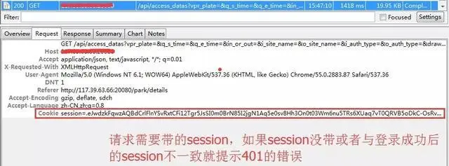 在截图中我们看到,输出的json字符串只有code是200的,再没有什么,但是后面的请求都需要带上session,我们看下一个接口请求的内容,见截图: