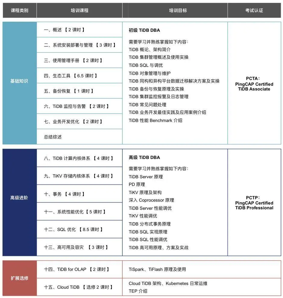 PingCAP 于 2018 年底正式成立 PingCAP University,开设的 TiDB DBA 官方认证培训课程于 2019 年 1 月正式落地。目前,首批线下培训已经开展 10 余期,得到了社区伙伴的广泛响应。培训开办半年以来 PingCAP University 在实践中保持与学员的沟通,持续打磨课程,近期正式推出升级后的 2.0 版本。在保留高密度干货、理论和实操相结合的一贯特点之外,本次升级有以下方面的优化: