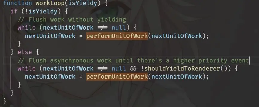大家可能会注意到该方法根据传进来的isYieldy分成了两个部分,这个isYieldy就表示本次的更新是否允许中断。当没有使用ConcurrentMode的时候或者本次更新已经超时的时候,这个isYieldy是false,也就是不允许中断,这两种情况都会把剩下所有的节点从头到尾一把梭,当节点贼鸡儿多的时候会卡。