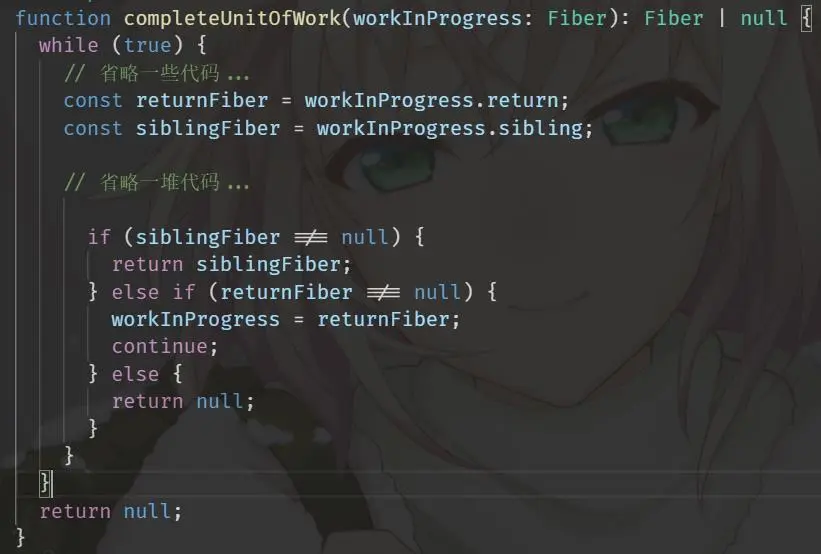 首先在看这个函数之前,我们回顾一下上一篇介绍fiber的属性,每个fiber都有个child属性指向它的firstChild,还有一个属性叫sibling指向它的兄弟节点。这个workLoop中,当判断到next,也就是当前这个节点的firstChild === null的也就是当前节点再没有子节点的时候就会进入completeUnitOfWork,然后completeUnitOfWork还会返回一个next。那这个时候问题就来了,beginWork和completeUnitOfWork返回的next你猜到底是不是一个东西呢?